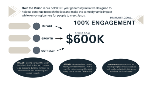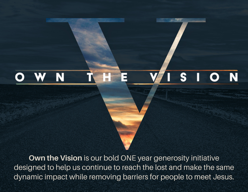 Own the Vision is our BOLD one year generosity initiative designed to help us continue to reach the lost and make the same dynamic impact while removing the barriers for people to meet Jesus.